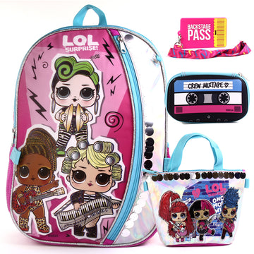 - 17 Inch Backpack, insulated lunch bag, molded pencil case, and Lanyard ID holder.